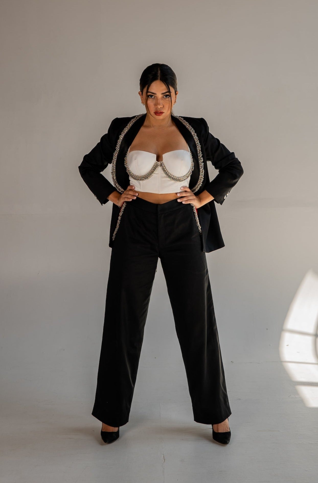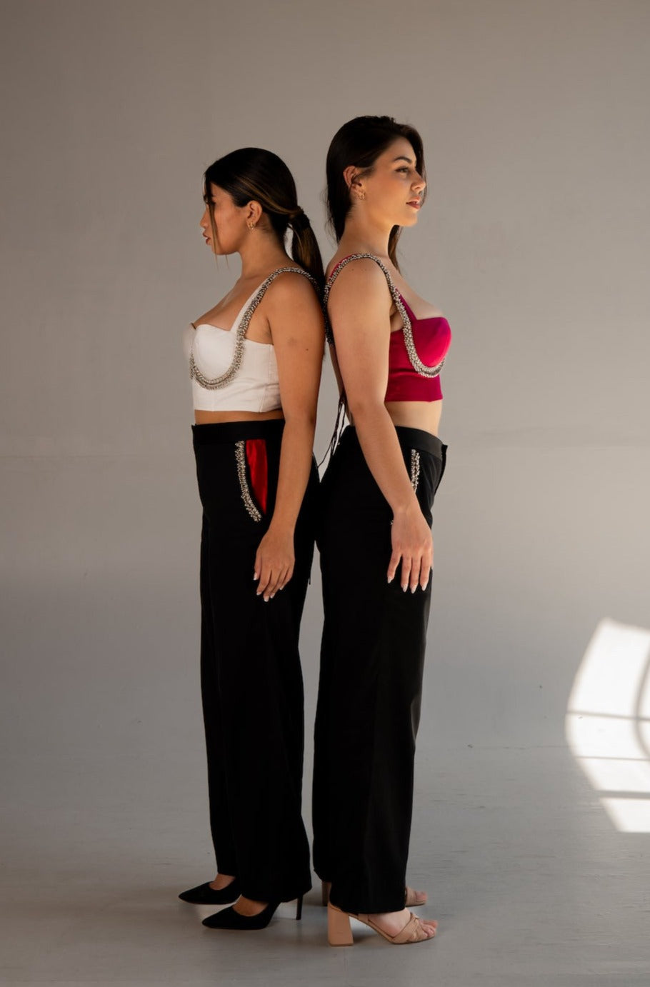 The Tula Bralette is a true head-turner! Adorned with anklet jewelry, this stunning bralette is made from a satin fabric. It can be worn as the statement piece in your look, or paired with the matching Payal Blazer and Pant Set for a complete outfit. Available in Pink and White.
